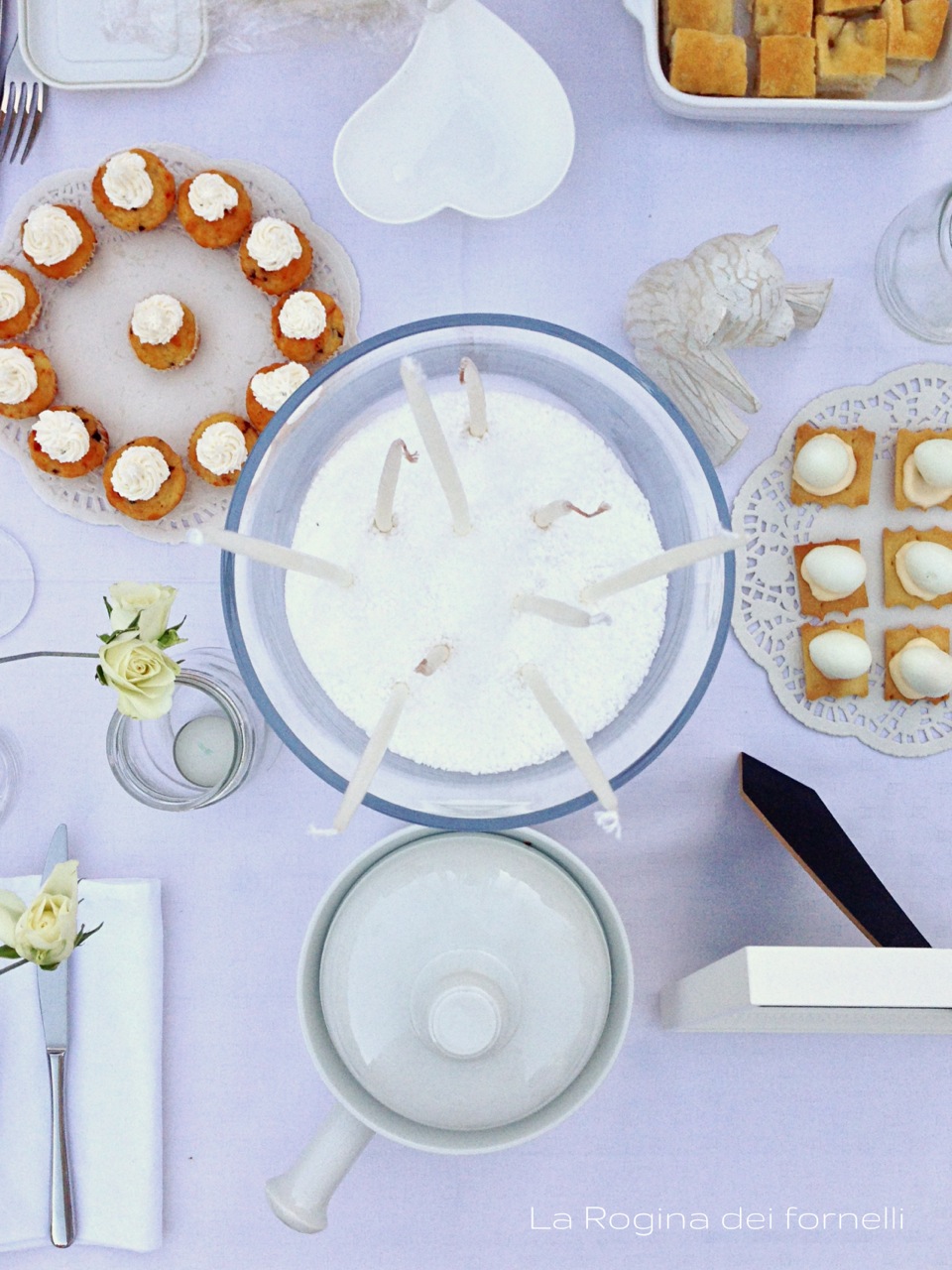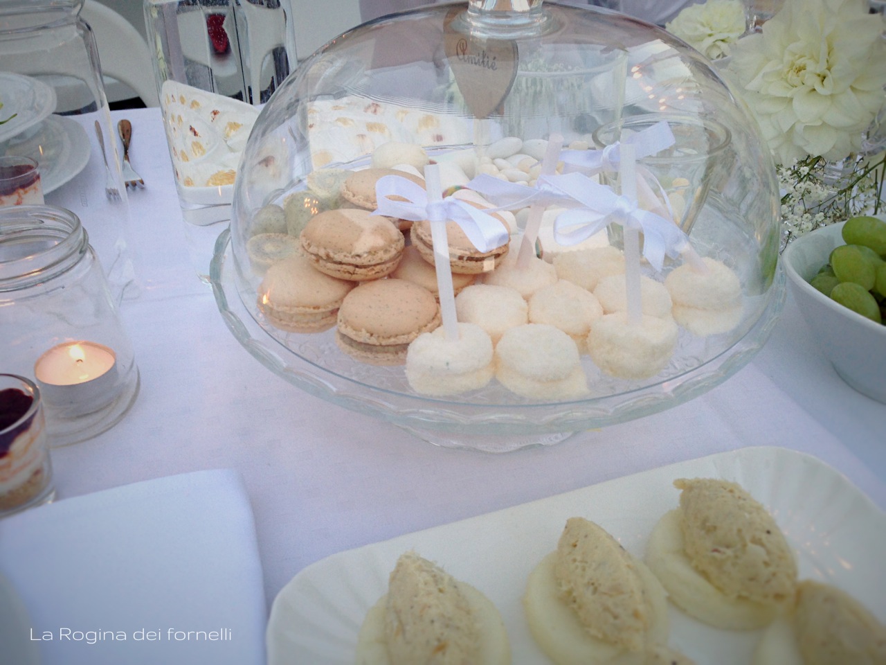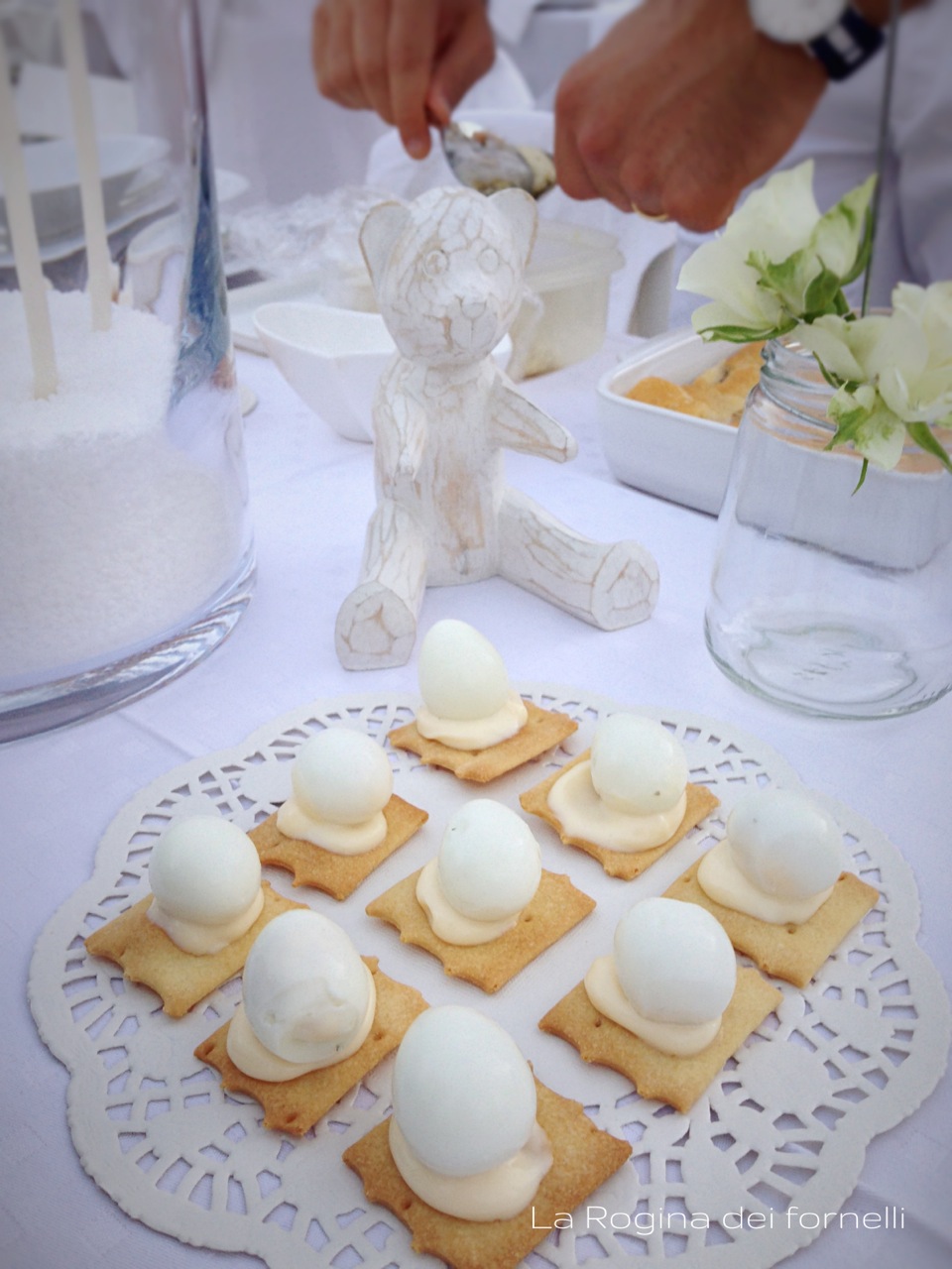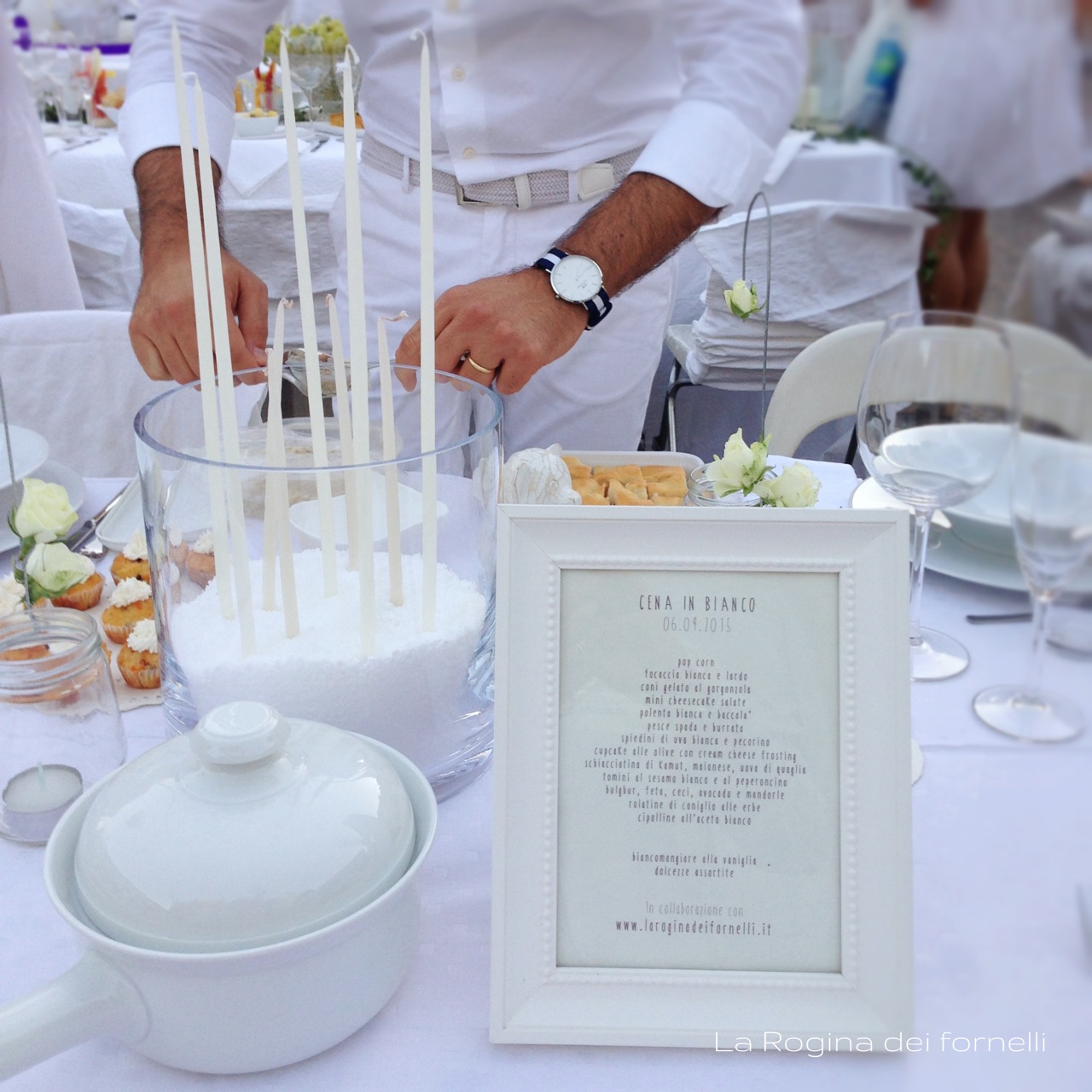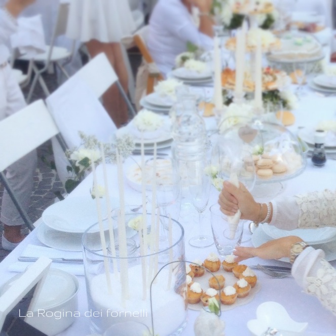 Poi mi ha spiegato che avremmo dovuto portarci il tavolo, le sedie, i piatti, i bicchieri, le decorazioni, il cibo, l’acqua, il vino … e lì ho avuto la conferma che sì, è matta! Purtroppo per noi (e, soprattutto, per i nostri mariti) io lo sono più di lei e, dopo la titubanza iniziale, mi sono messa a pensare a cosa potevo cucinare per restare in tema “total white”! Pensa che ti ripensa … ecco il nostro menù in bianco!
