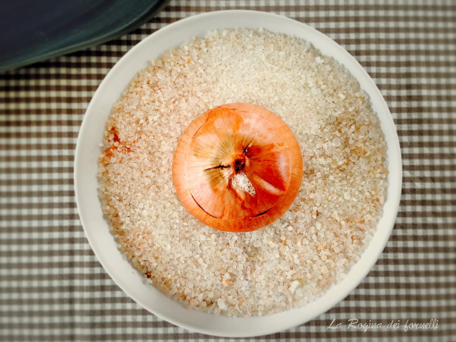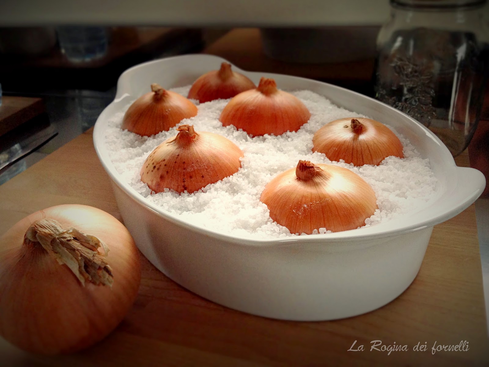 - versare un po’ di sale grosso in una pirofila alta e capiente, mettere le cipolle con la buccia e riempire col sale grosso gli spazi tra le cipolle, aggiungendo sale fino a coprire per quanto possibile