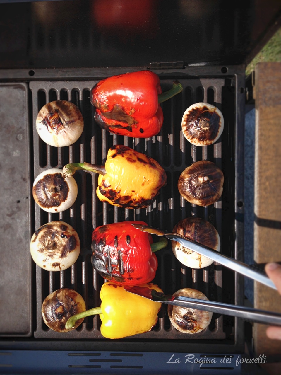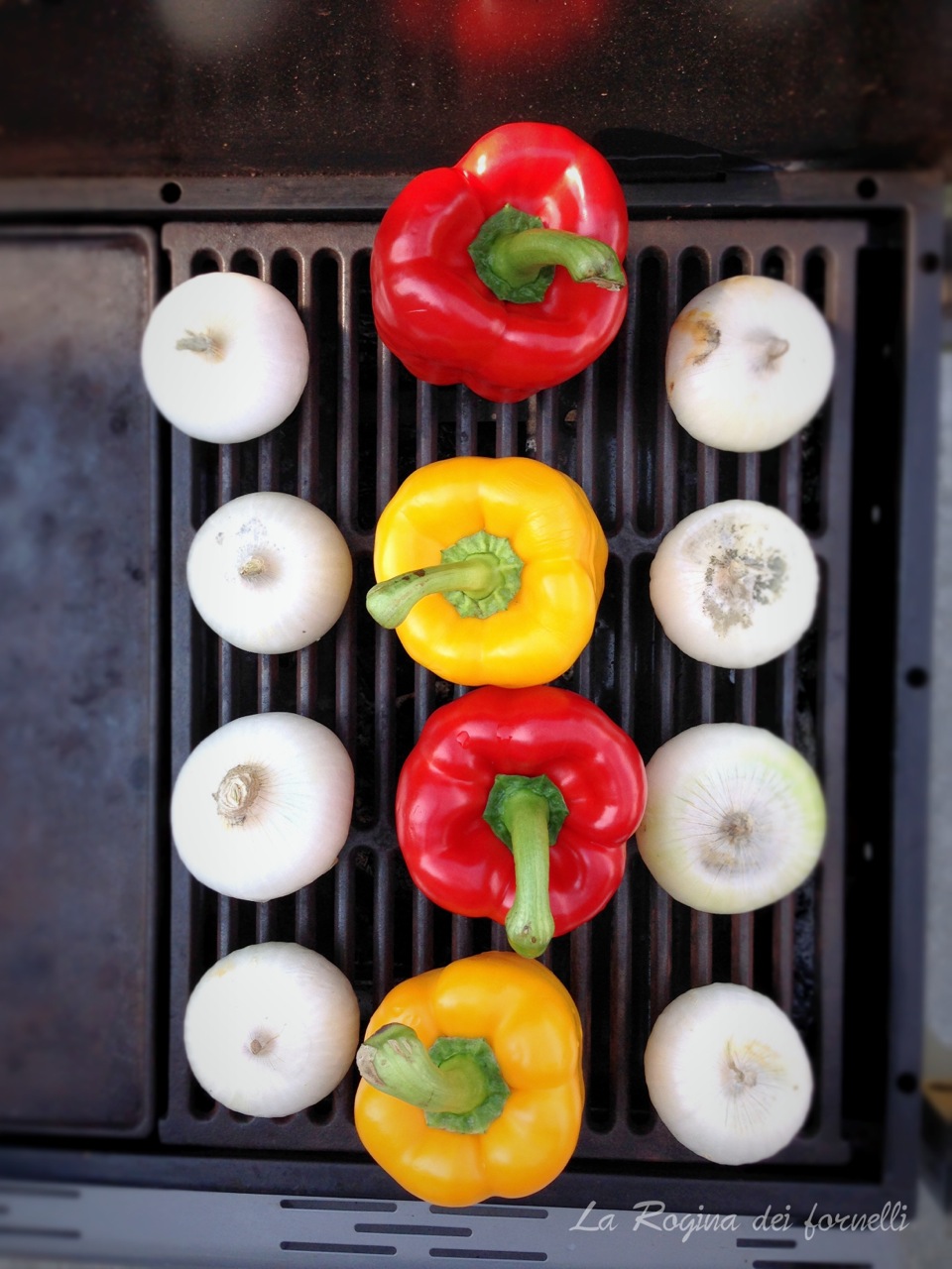 - fate la stessa cosa su tutti i lati (devono venire come nelle foto qui sotto: tenete presente che le cipolle devono rimanere croccanti, ma allo stesso tempo non devono essere crude … prendendole con le pinze inizieranno a sembrarvi morbide, ma lasciatele sulla griglia ancora 10 minuti perché deve cuocere anche il cuore)
