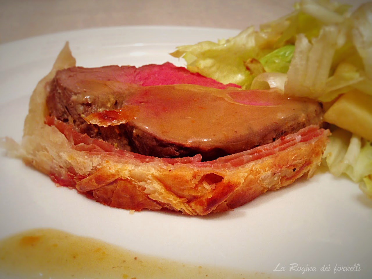 NB : la cottura è l’elemento fondamentale della ricetta! Può cambiare il risultato da “piatto buono” a “piatto eccezionale”! Varia moltissimo in base alla dimensione del filetto (quindi dal numero di commensali ma anche dalla posizione del filetto più o meno vicina alla coda). Per questa ricetta è molto utile un termometro … un trucchetto per farne a meno è bucare la carne fino al cuore e guardare il liquido che esce: se è rosso significa che è ancora poco cotto, se è rosato significa che dovrebbe essere al punto giusto … se non vedete liquido … ehm … troppo tardi! Tenete inoltre presente che qualche minuto di riposo prima di tagliarlo è indispensabile, ma che anche in questa fase la cottura continua! Non aspettate troppo! Io cerco di prendere la parte centrale del filetto: la parte alta è troppo grossa e per riuscire a fare delle fette decenti dovete prenderne 100 kg, la parte della coda, al contrario, è troppo piccola e viene inevitabilmente troppo cotta (se il macellaio ha solo questo pezzo vi consiglio di eliminare la parte terminale e cucinarla in padella il giorno dopo, che è sempre un bel mangiare!). Ultima cosa: al momento dell’acquisto tenete conto del fatto che in cottura si riduce parecchio!