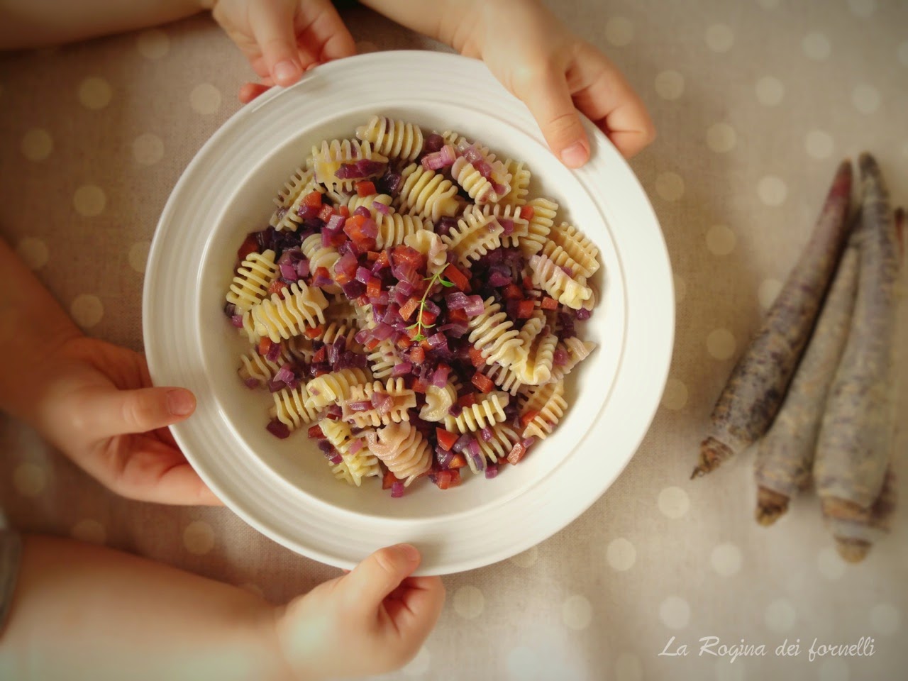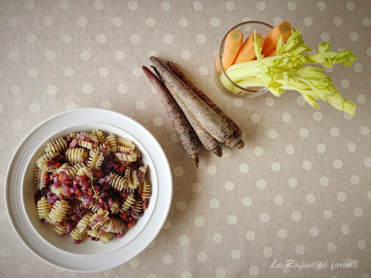 Diciamo che è un po’ un trucco per far mangiare le verdure ai bambini … io questo condimento lo trovo più adatto per un’insalata tiepida d’orzo o di riso ecc … ma per cambiare un po’ va benissimo anche per un piatto pasta caldo, ma anche a temperatura ambiente.